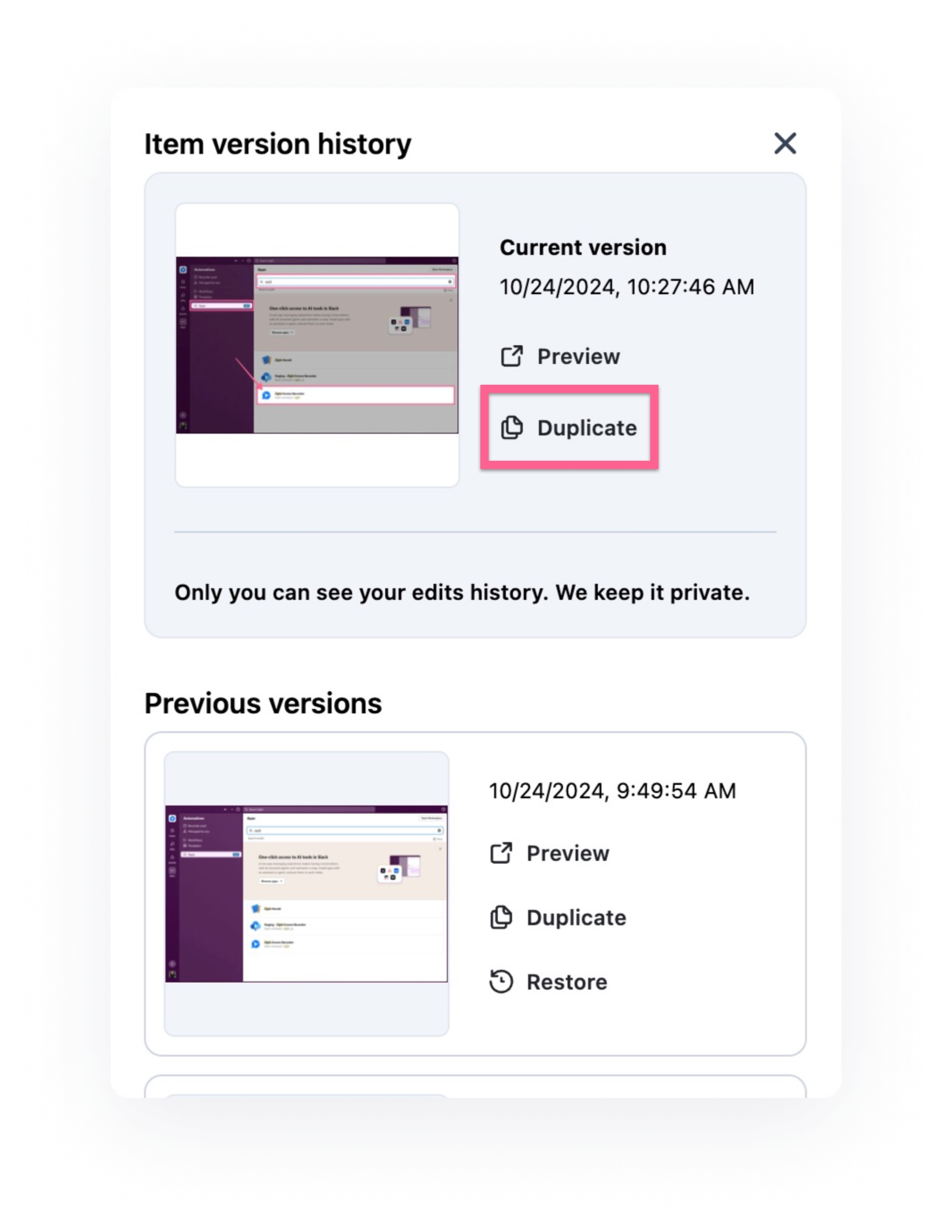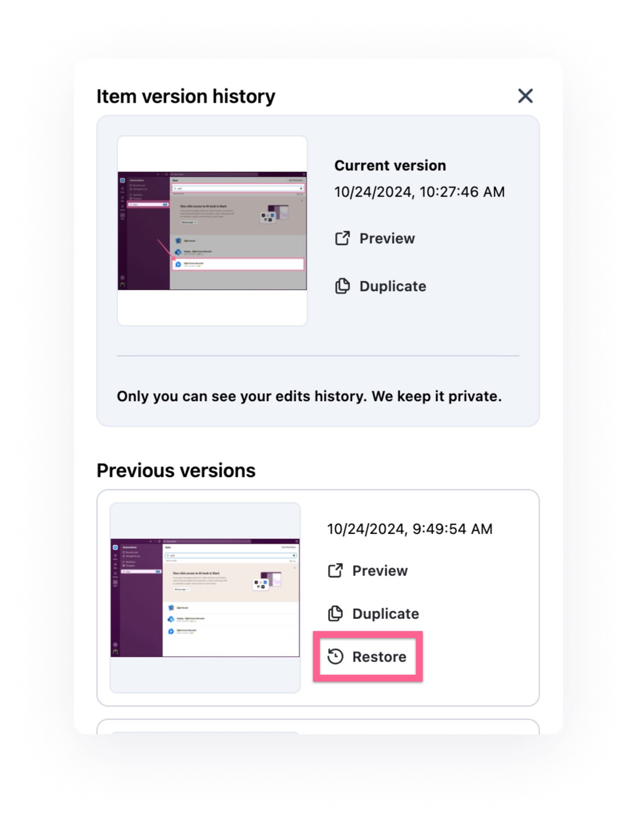Yes, we ensure that only the content owner can see the version history. Even when you share content with the right to edit, other workspace members and workspace admins cannot see the version history, keeping it 100% private.