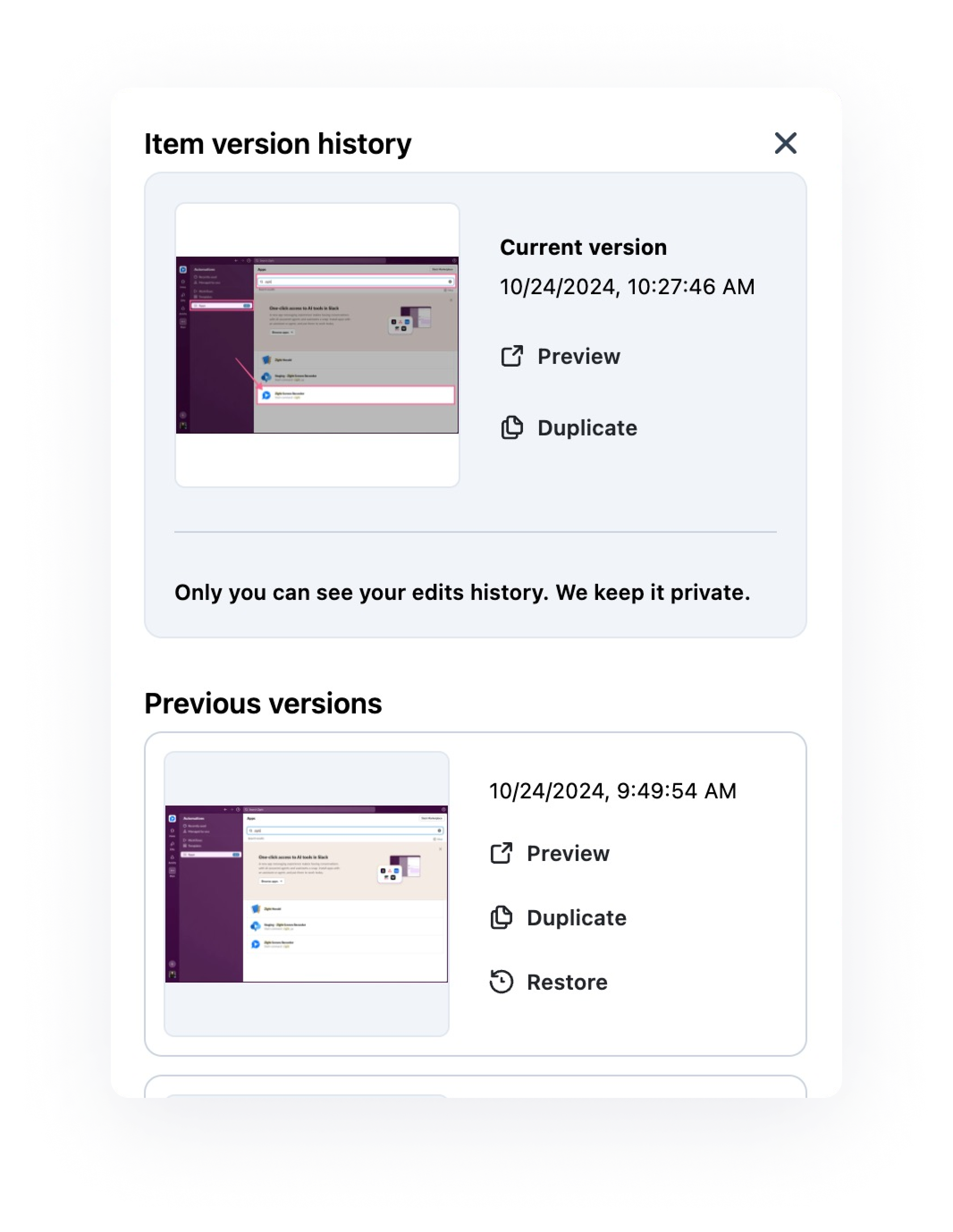 Restore or replace historical versions of your screenshots or video recordings. You can easily see and review changes to your content in detail with a date and time stamp and restore or duplicate it. This gives you complete control over your content’s history, letting you manage revisions easily.