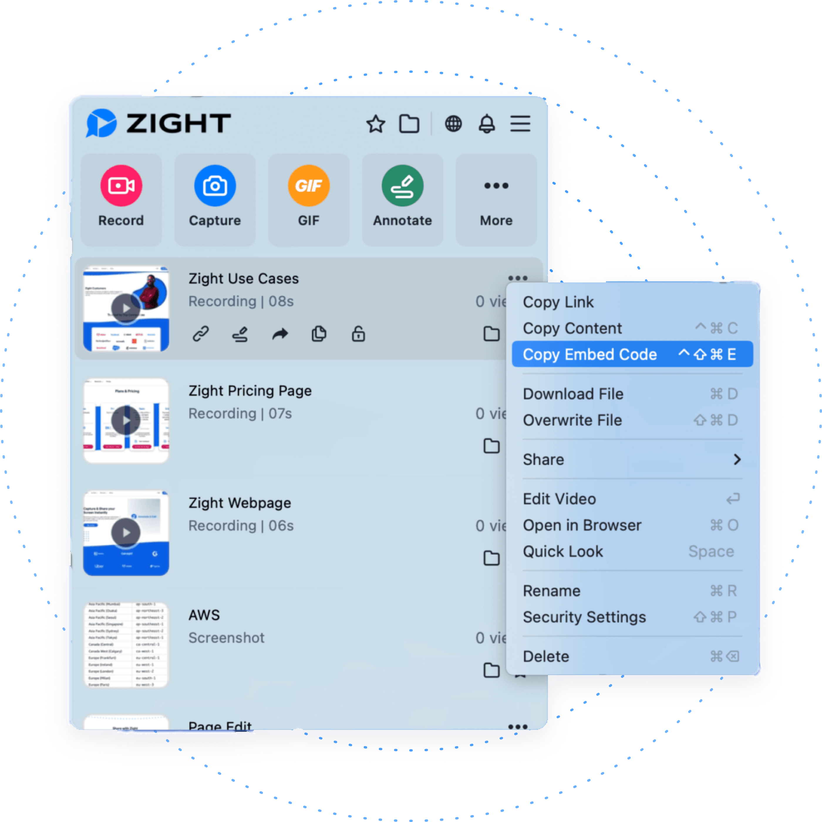 Capture the content you want to embed. This can be a video recording, screenshot or GIF. Any content you capture in Zight can be easily and quickly embedded onto a website.