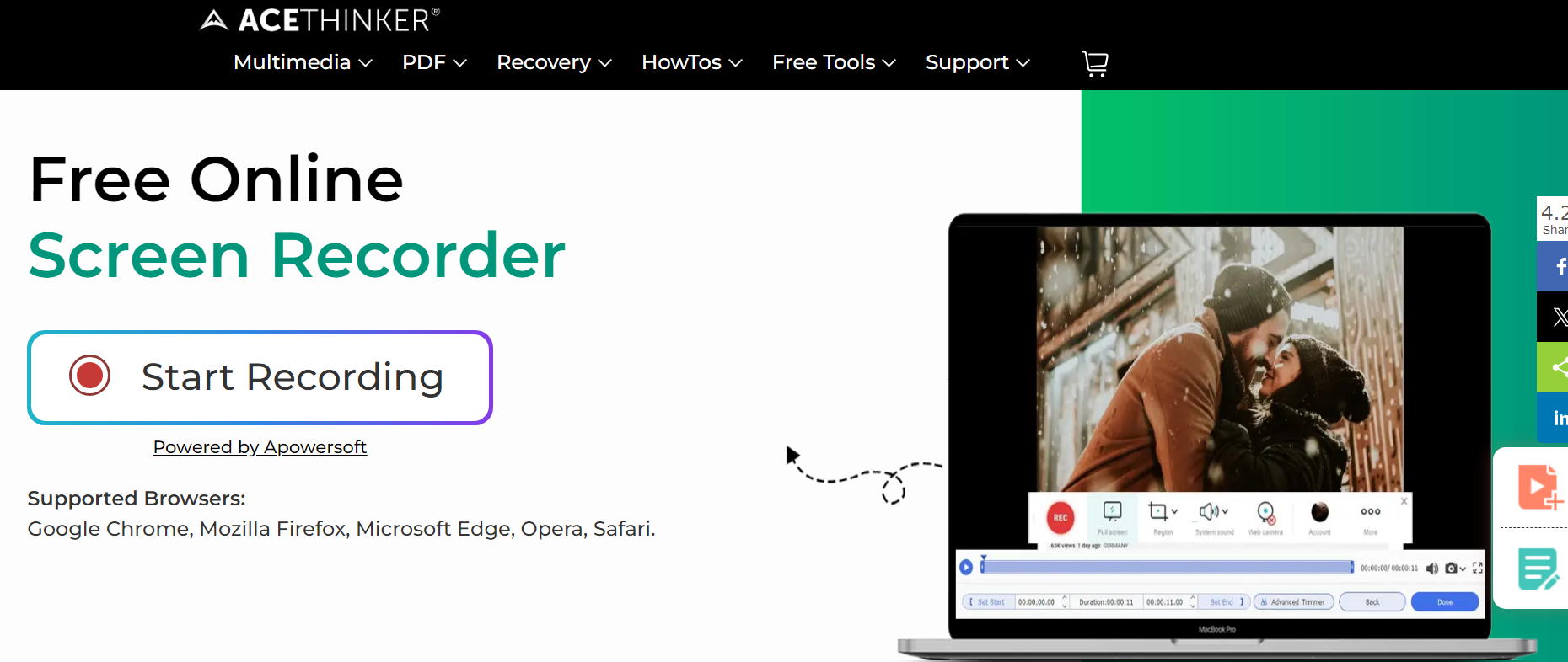 When you are struggling with storage space but still need to capture your screen, oen of the best free screen recorders is the AceThinker Free Online Screen Recorder. It should be your go-to web solution for capturing screen activity without the hassle of watermarks. It’s popular for its seamless functionality, allowing users to effortlessly record in crisp 1080p quality and export with ease.
