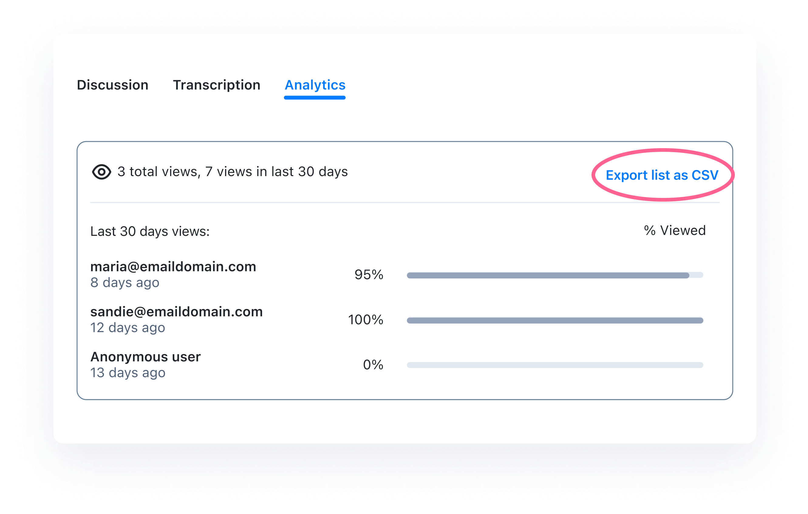 With our Enterprise plan, admins have the ability to export viewer emails and timestamps for further insights to help drive business decisions.