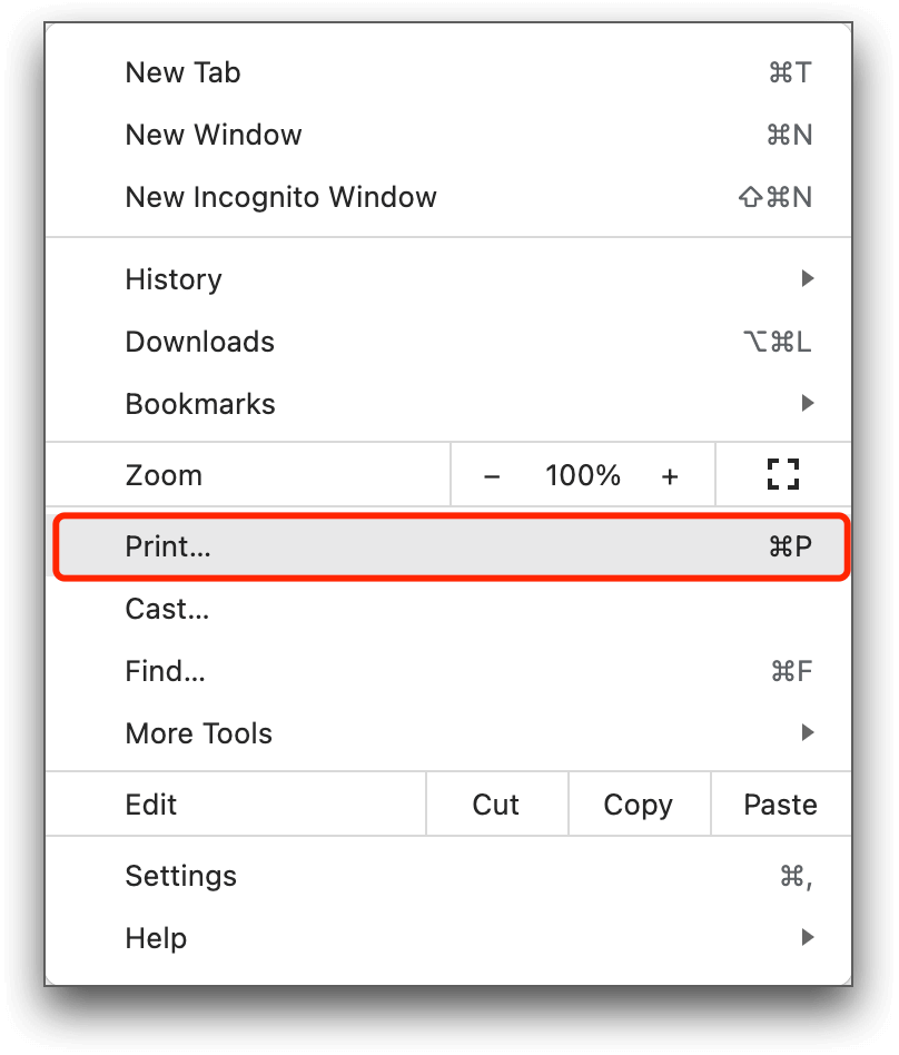 Step 2: Click the three dots button in the top-right corner of Chrome, then navigate to File > Print from the drop-down menu… (If the menu bar is not visible on Windows, press F11 or right-click on the webpage and choose Print…). Alternatively, you can press the keyboard shortcut “Ctrl + P” on Windows or “Command + P” on Mac to open the print dialog.
