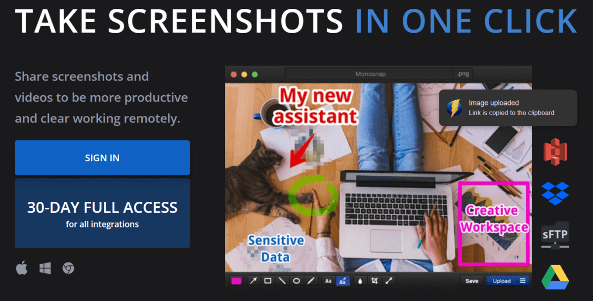 With its integration into the cloud, Monosnap is suitable for professionals and students since one can connect the cloud drives such as Dropbox, Google Drive, or FTPs to upload screen-recorded videos and share them with other PCs and smartphones.