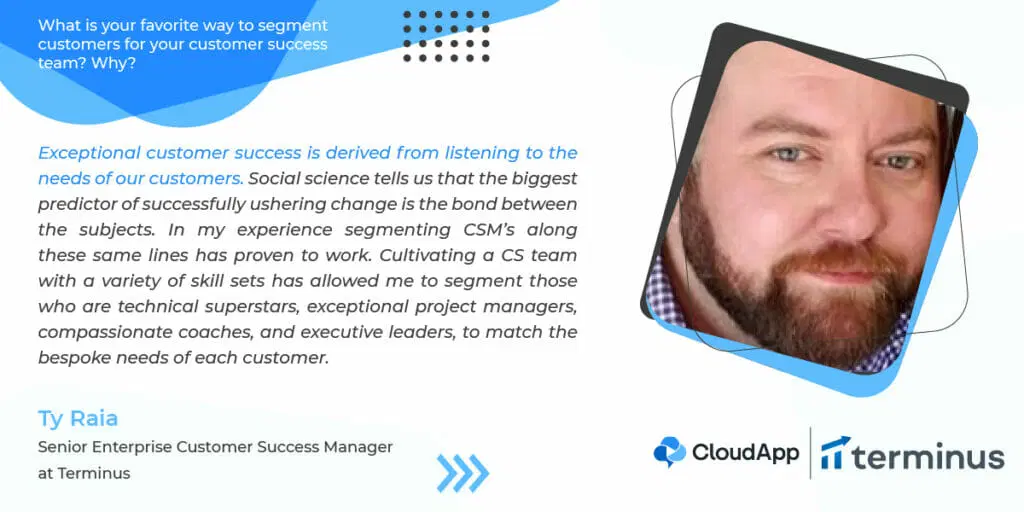 “Exceptional customer success is derived from listening to the needs of our customers. Social science tells us that the biggest predictor of successfully ushering change is the bond between the subjects. In my experience segmenting CSM’s along these same lines has proven to work. Cultivating a CS team with a variety of skill sets has allowed me to segment those who are technical superstars, exceptional project managers, compassionate coaches, and executive leaders, to match the bespoke needs of each customer.”