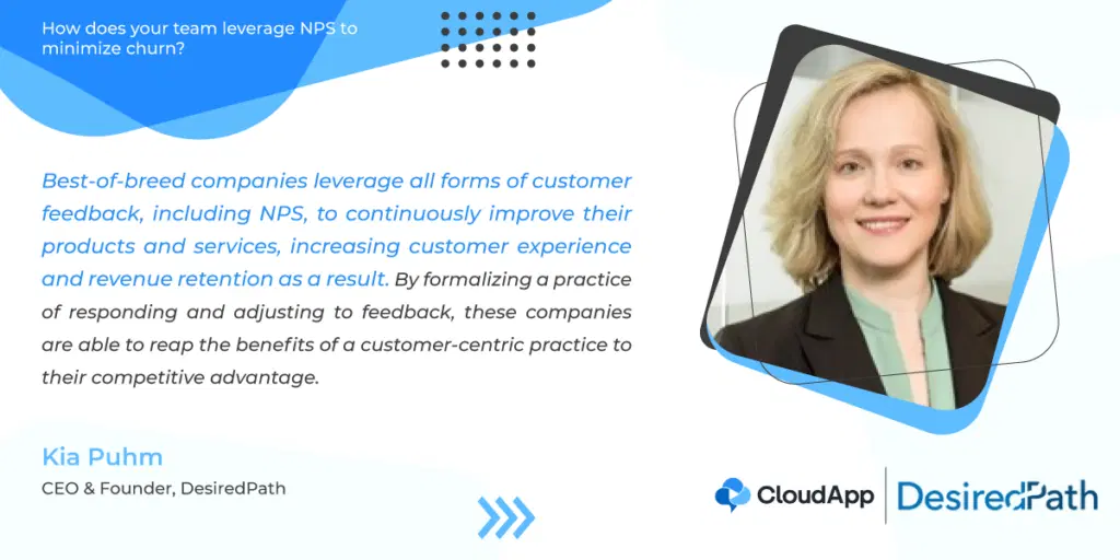 Best-of-breed companies leverage all forms of customer feedback, including NPS, to continuously improve their products and services, increasing customer experience and revenue retention as a result. By formalizing a practice of responding and adjusting to feedback, these companies are able to reap the benefits of a customer-centric practice to their competitive advantage.